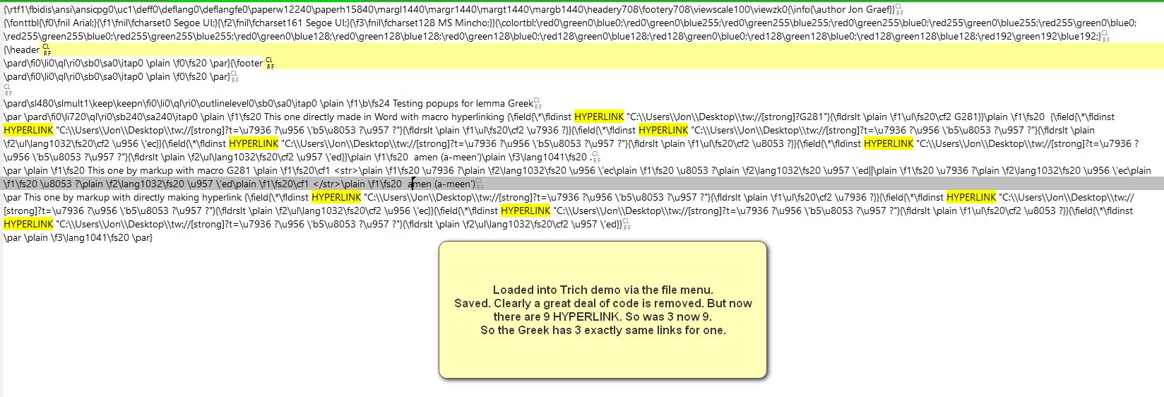 Now save it without changing anything and now look at the RTF code. The hyperlink code appears to double for the unicode links.