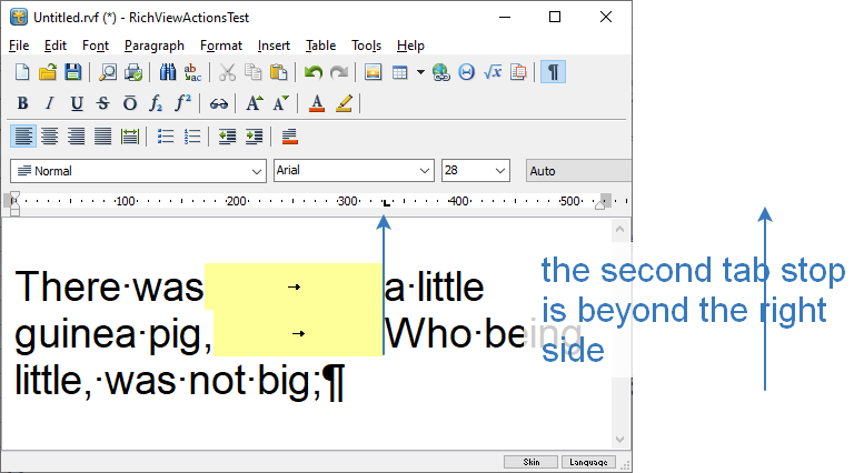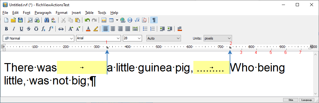 But tabs are very different. There are no tab properties that are stored in files (except for text attributes, like font or color). Tab position (distance from the left size), alignment and leader characters do not belong to the tab properties. They are assigned when document is formatted. In TRichView, line wrapping depend on window width. This means that when you resize TRichView window, some tabs may be moved to the new line, so their positions, alignment and leader characters may be different.