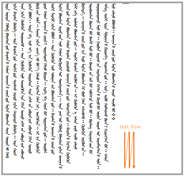 •For vertical traditional Mongolian text, use Rotation=rvrot90, VAlign=rvcBottom, Options=[rvtcoReverseLineOrder]. In this script, columns are ordered from left to right.