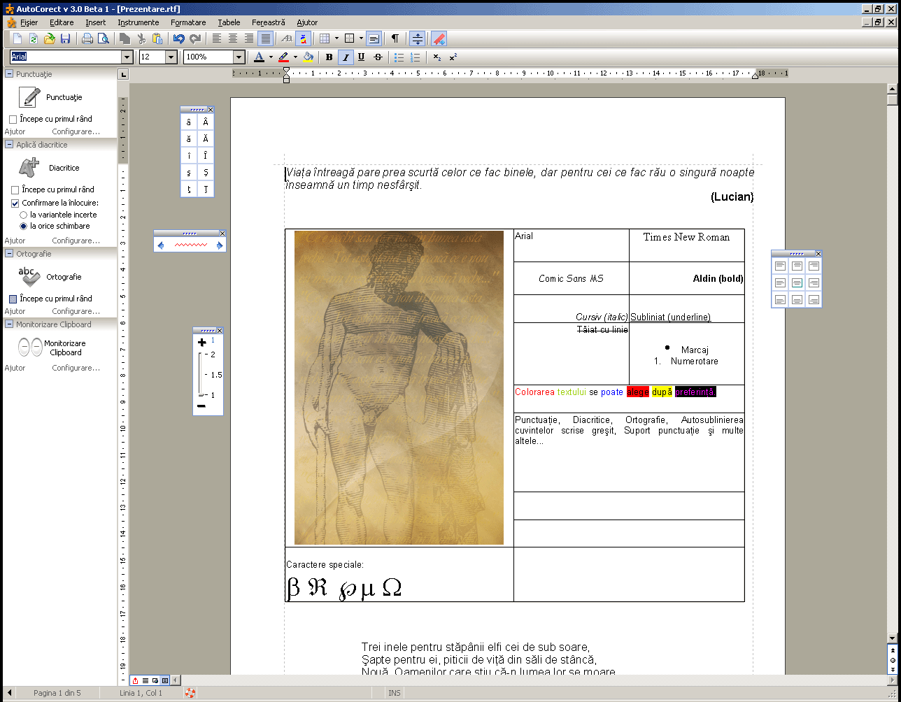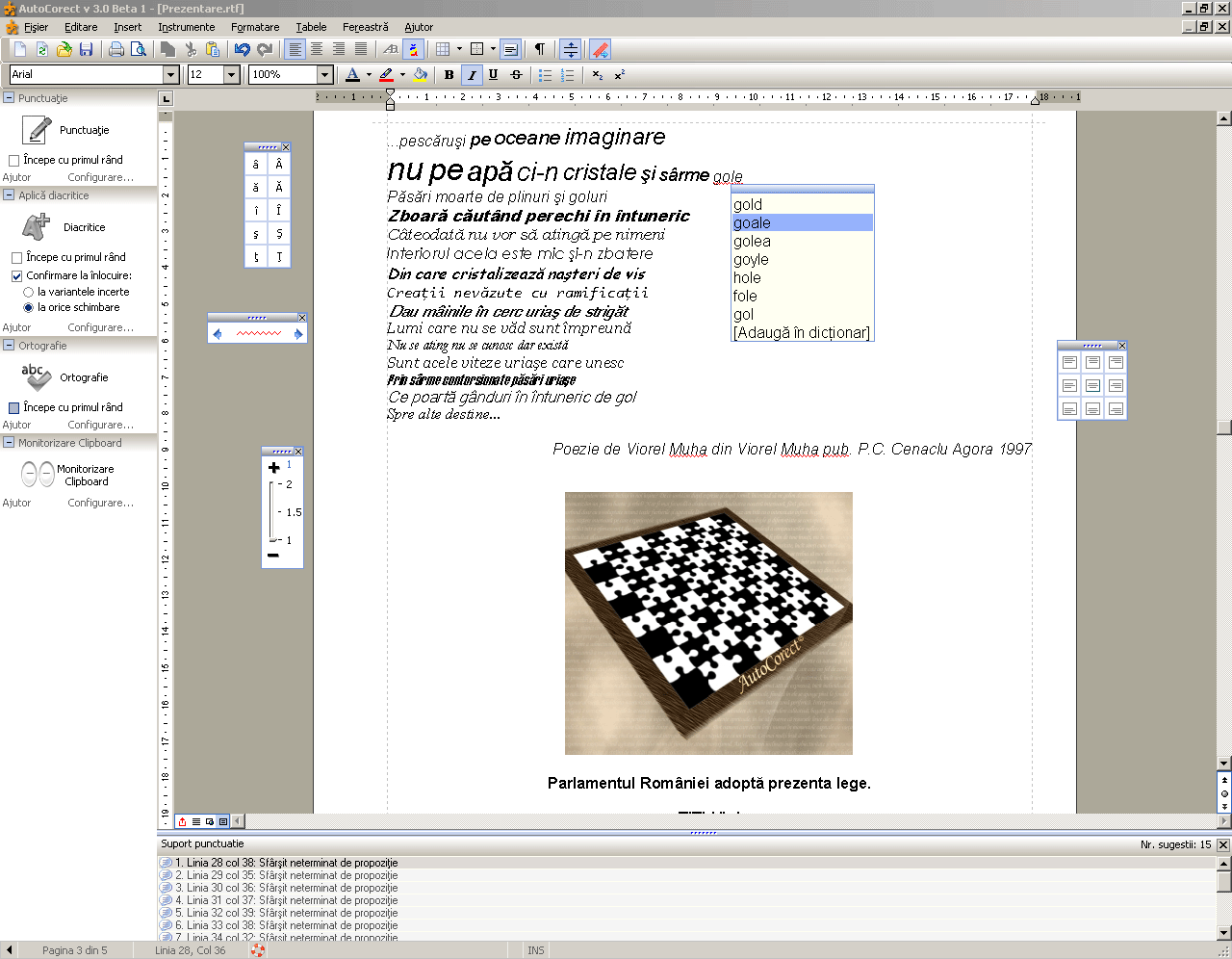 AutoCorect is a tool for autocorrection of texts written in Romanian language by yourself or others. Bachelor's degrees, essays, or other materials are now much easier to correct, concentrate on what you have to write and leave the rest, AutoCorect will help you. The purpose of this program is to enrich the written words, with diacriticals, to correct punctuation, as well as misspelled words.