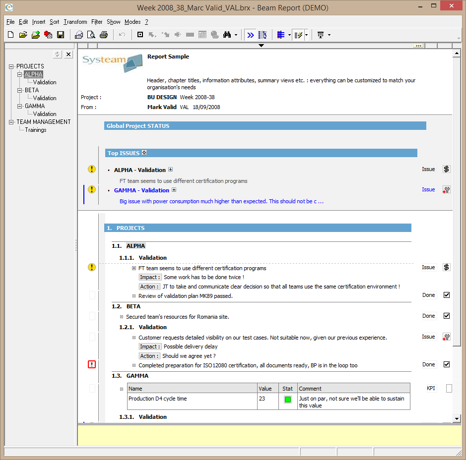 Beam Report makes qualitative reporting simple: smart weekly-reports with a better quality of information, easy to create and use. Save time, decide with better visibility, help establish sound management practices.