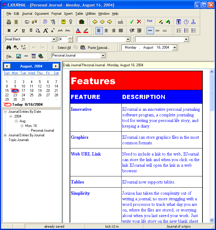 EJournal is an innovative personal journaling software program, and a complete journaling tool for writing your personal life story. EJournal is specifically designed to make keeping a journal or diary simple, easy and convenient.
