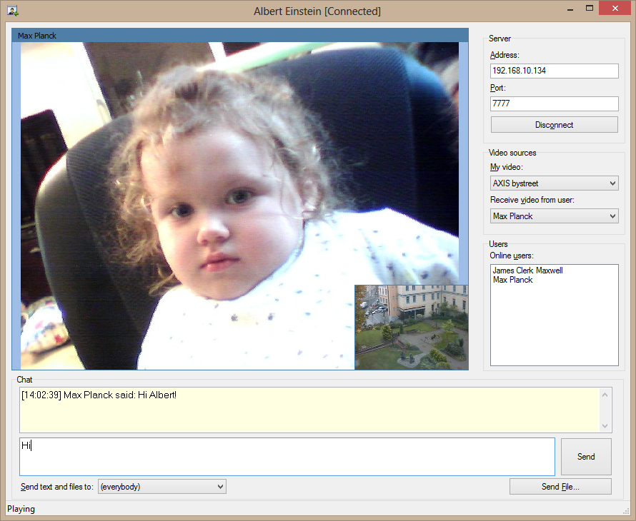 These applications connect to the media server demo (see above) and can send to each other: video, sound from a microphone, files, text messages.