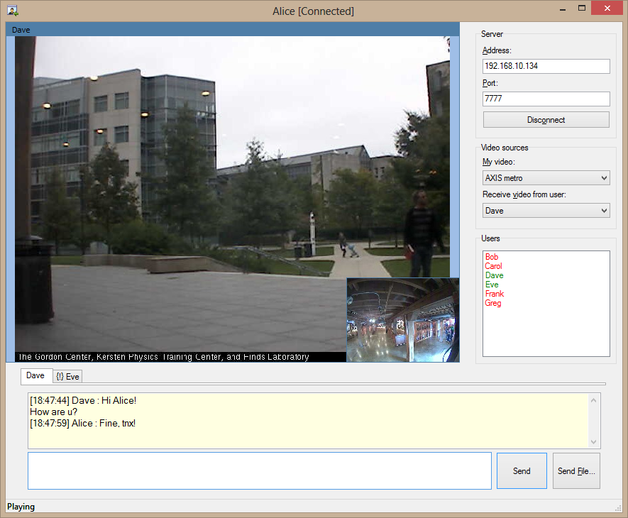 - Chat sends messages and files to all other members of the group (but can send them privately); messages are shown in a common chat text viewer.