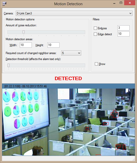 - detection threshold: specifies how many areas must be changed to show an alarm message ("detected!");