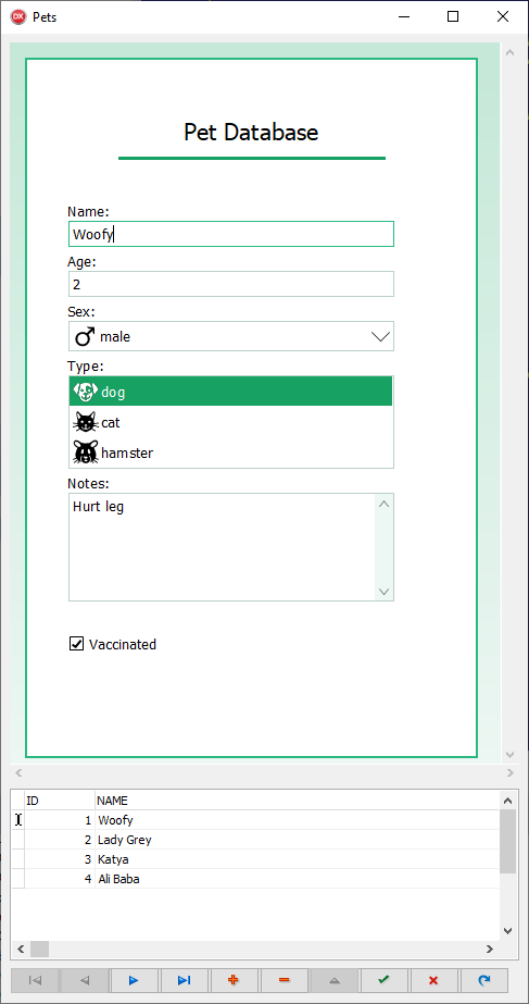 SRVControls are used to create a database input form in a ScaleRichView document SRVControls\Demos\Delphi\PetsDB.FireDAC_IB\