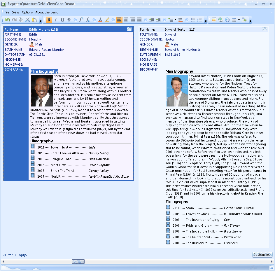 The package includes rich text editors, working both as standalone editors and as inplace editors in QuantumGrid. The editors support ExpressSkins™ and ExpressSpellChecker™.